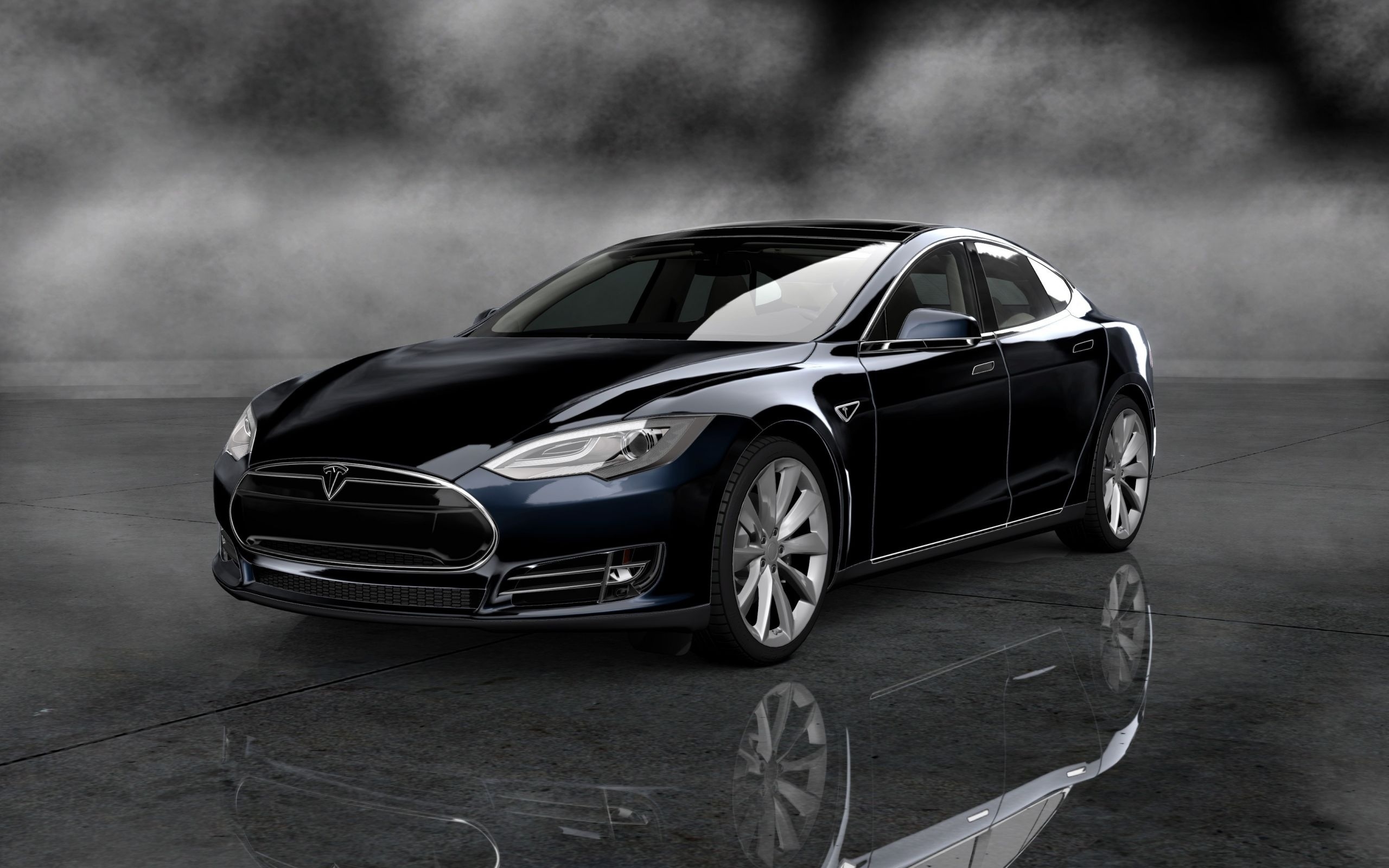 Description: A black tesla car is shown in a black and white photo with a reflection of the car on the floor.