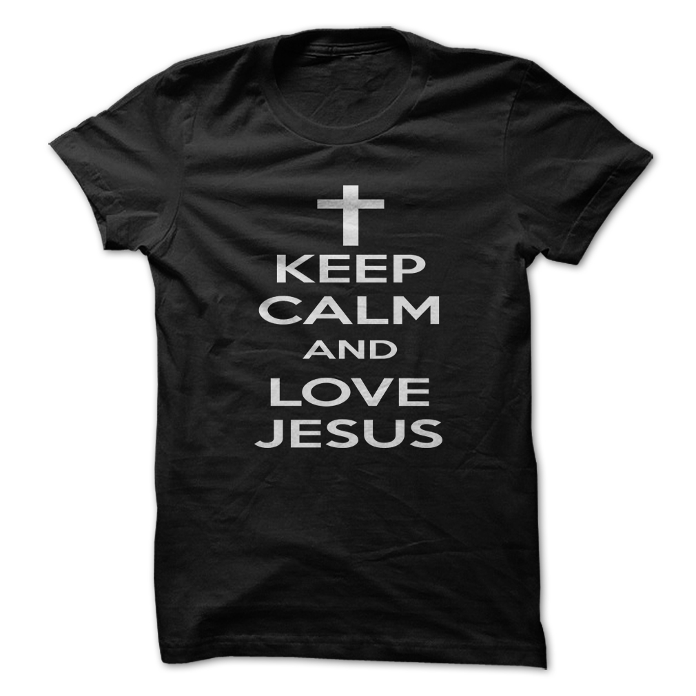Description: A black t - shirt with the words keep calm and love jesus on it.