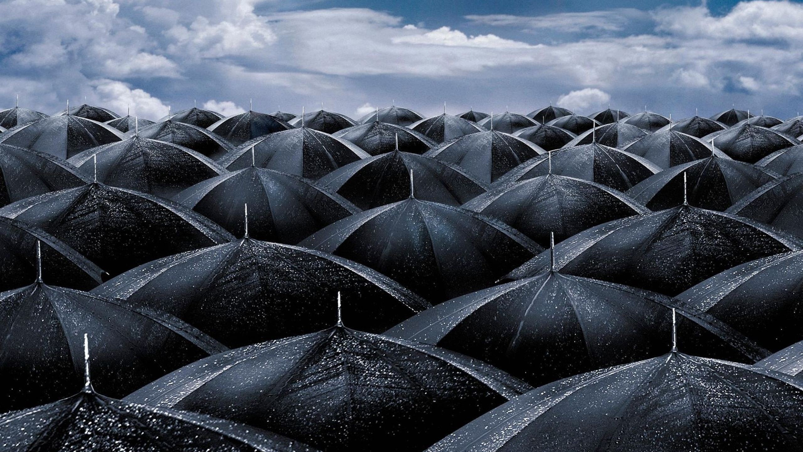 Description: A large group of umbrellas with a sky background and clouds in the background.