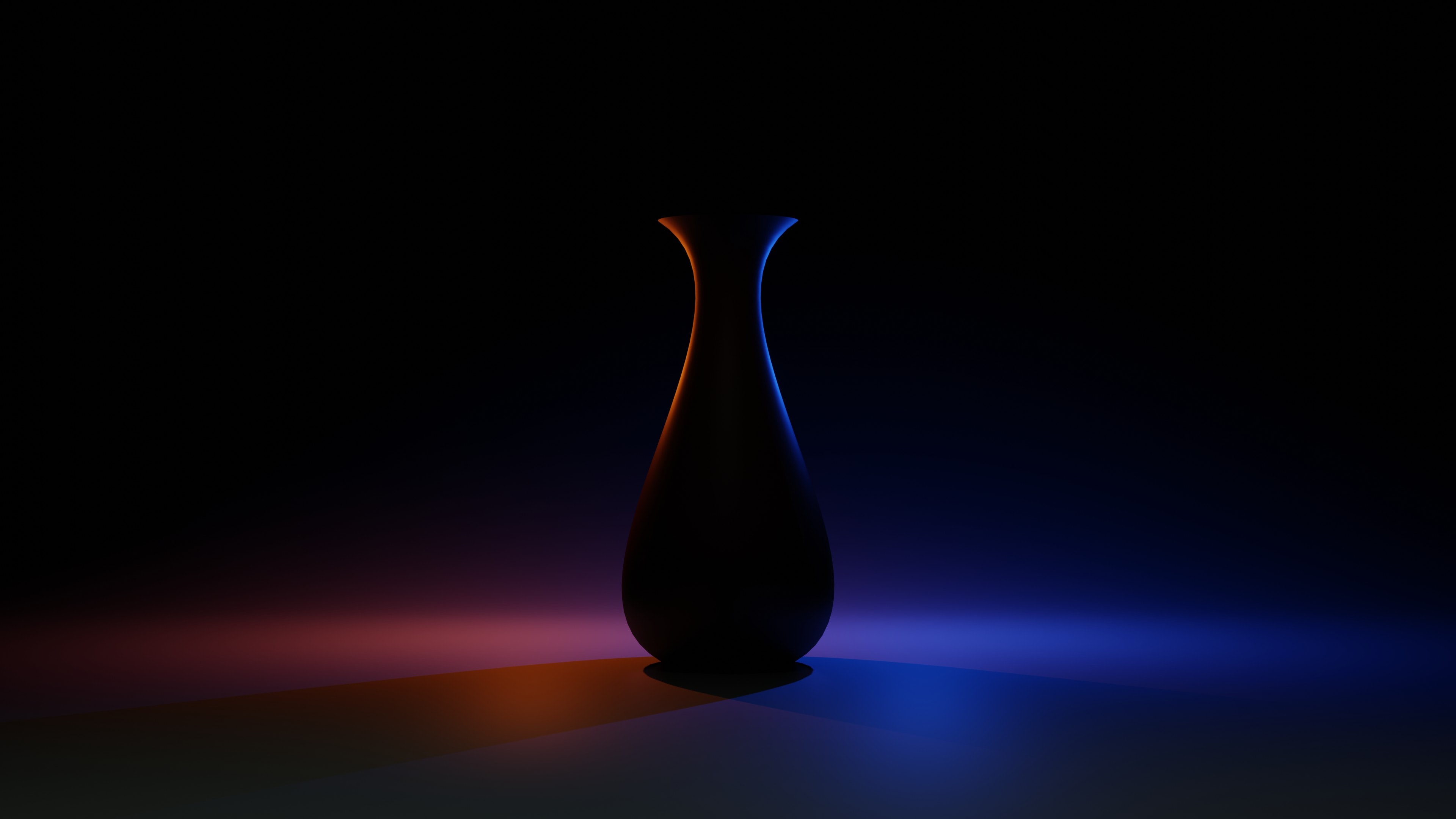 Description: A black vase with a blue and red light in it's center on a dark background with a shadow.