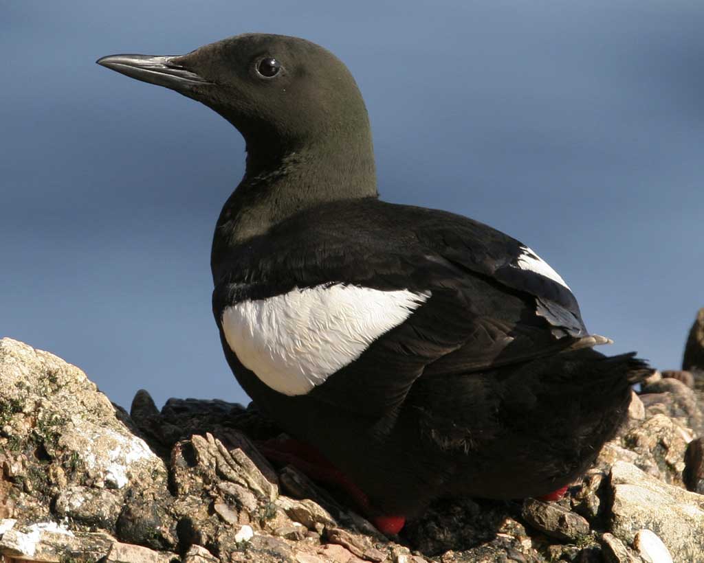 Description: A black and white bird sitting on a rock in the sun with a blue sky in the background and a few clouds in the sky.