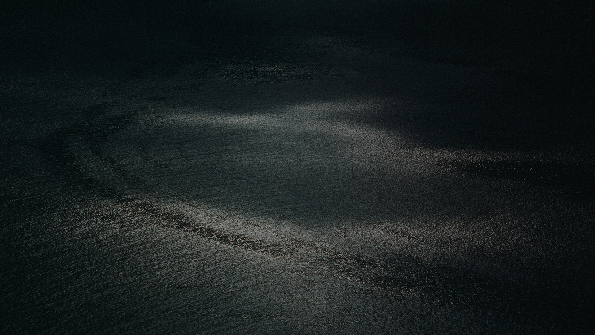 Description: A black and white photo of a boat in the water at night time with a light on the water.