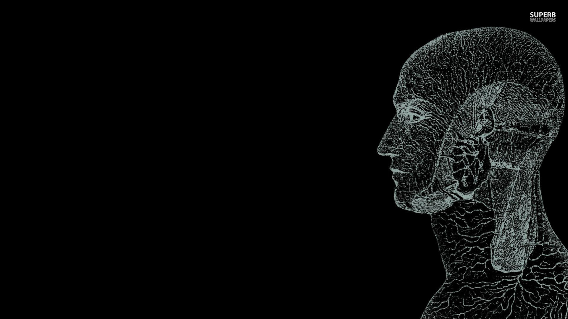 Description: A black and white image of a human head with a brain map on it's side and a black background.