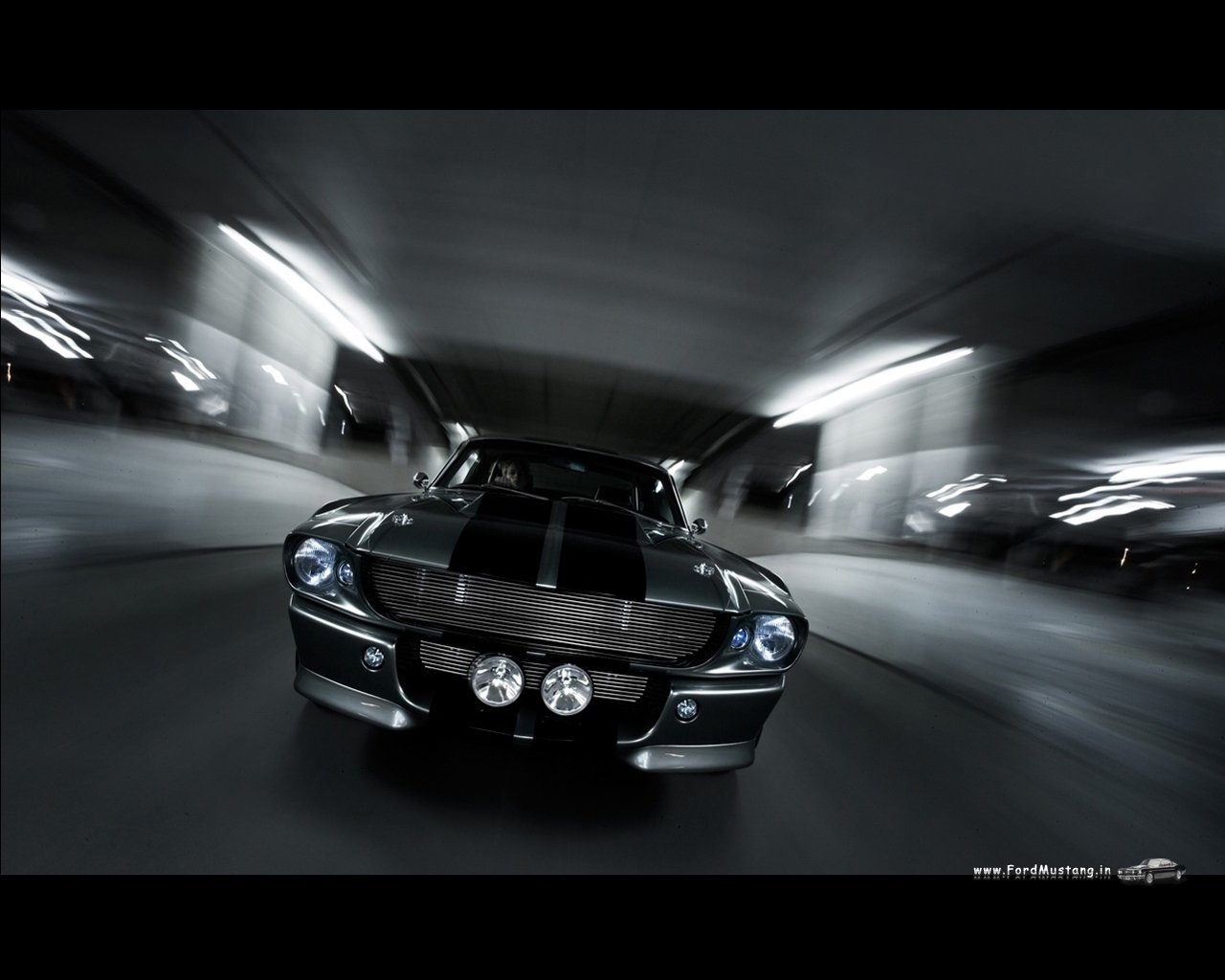 Description: A black and white car driving through a tunnel with lights on it's headlight and a black stripe on the front of the car.