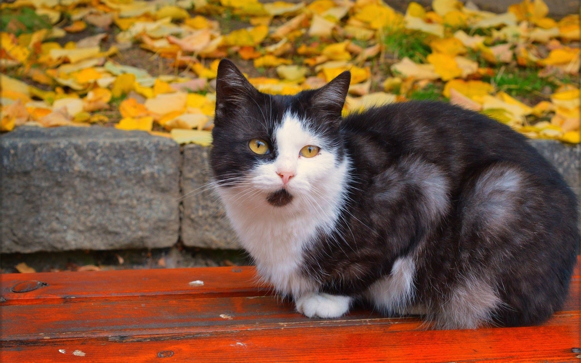 Description: A black and white cat sitting on a wooden bench in front of a pile of leaves and a brick wall.