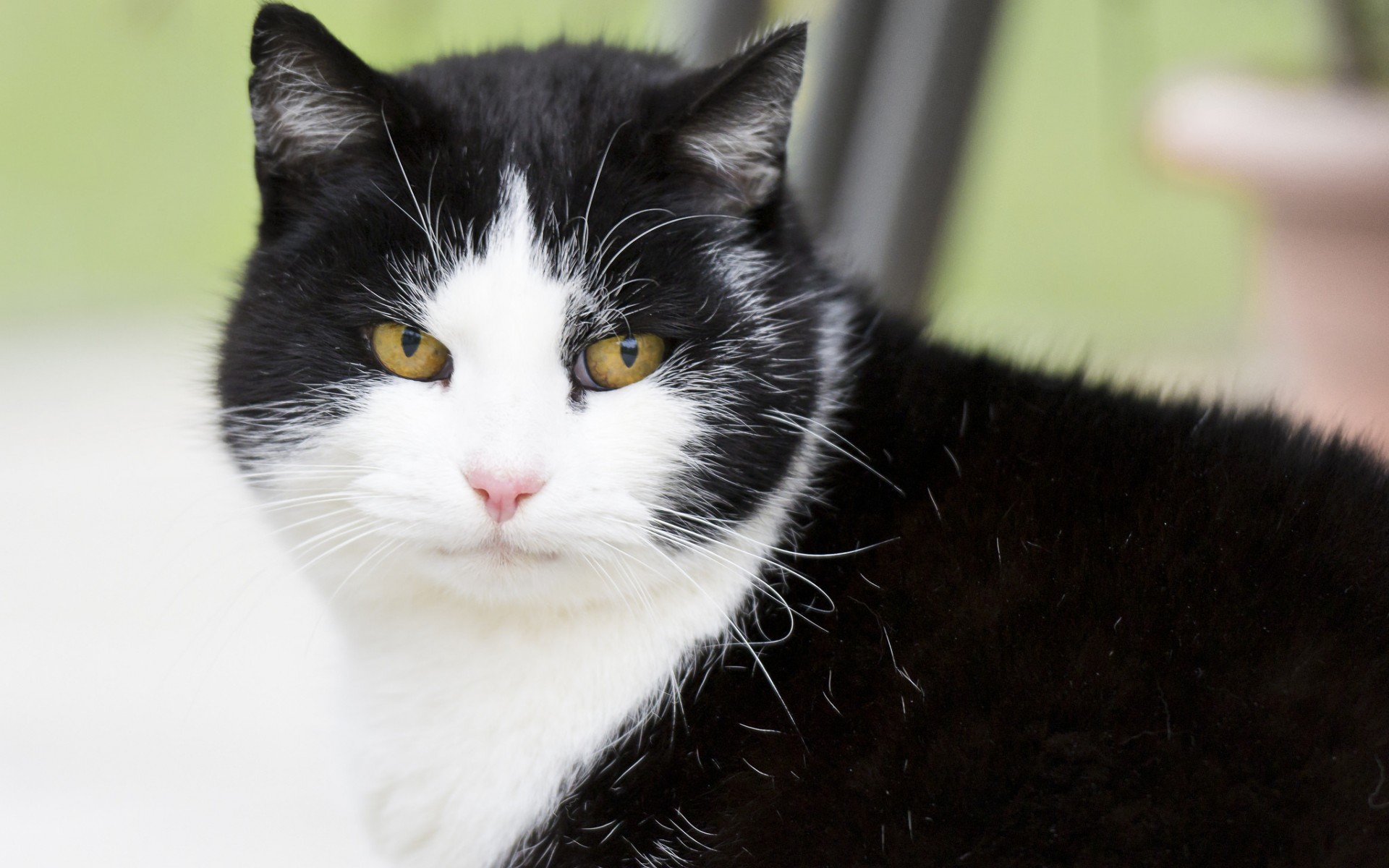 Description: A black and white cat sitting on a table looking at the camera with a serious look on its face.