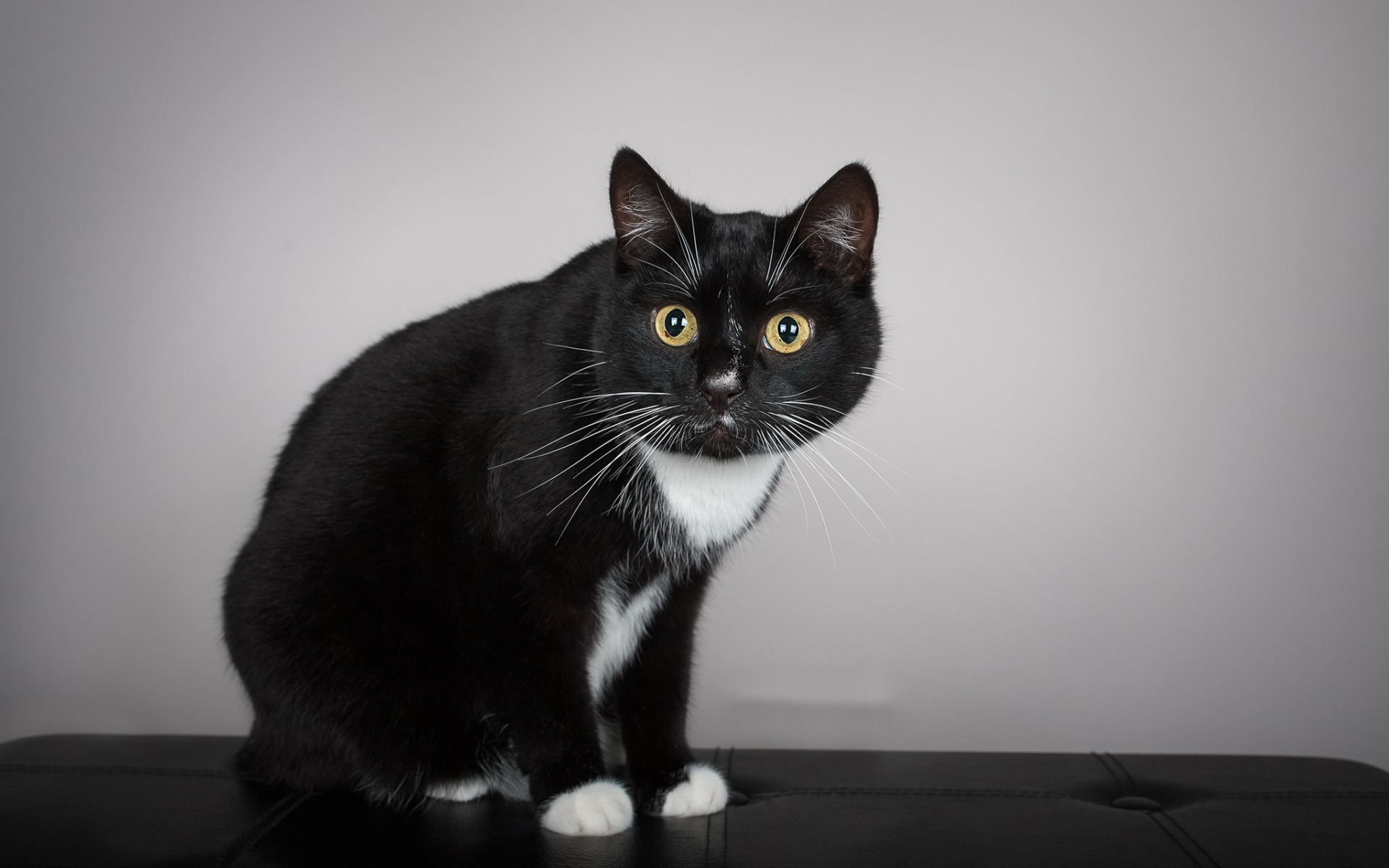 Description: A black and white cat sitting on top of a table next to a wall and a gray wall behind it.