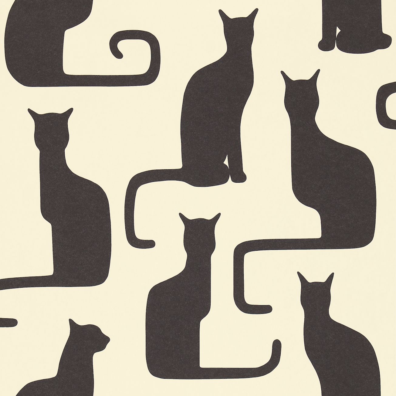 Description: A black and white picture of cats on a white background with a black cat silhouette on the right side of the picture.