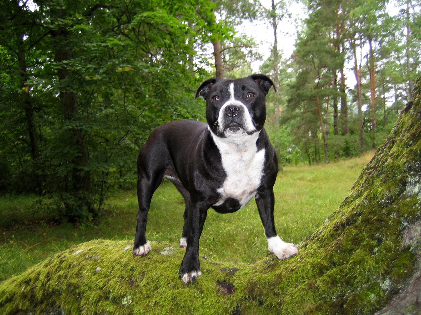 Description: A black and white dog standing on a moss covered rock in a forest area with trees in the background.
