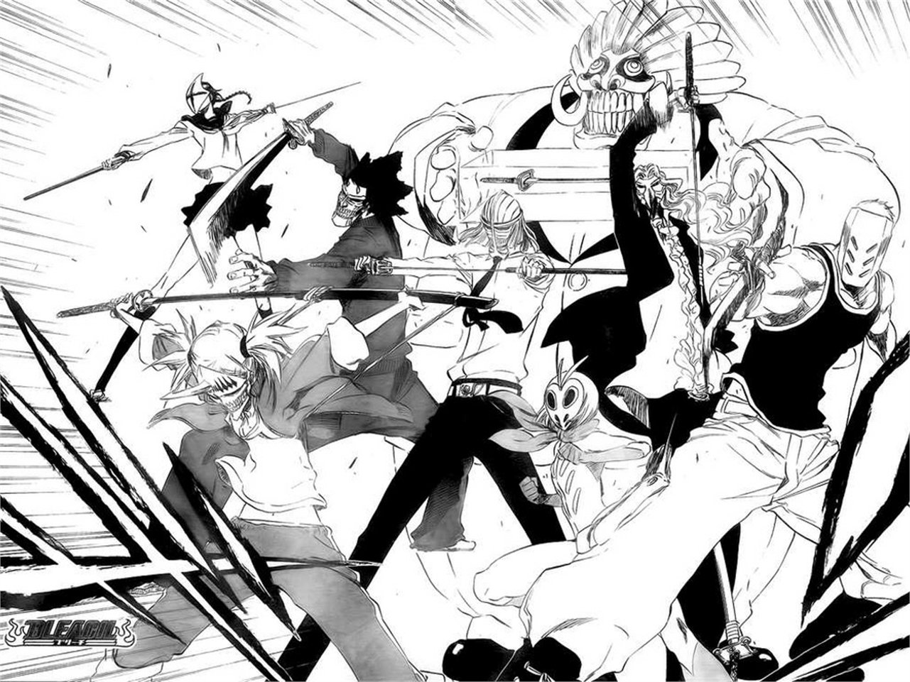 Description: A black and white drawing of a group of people with swords and swords in their hands.