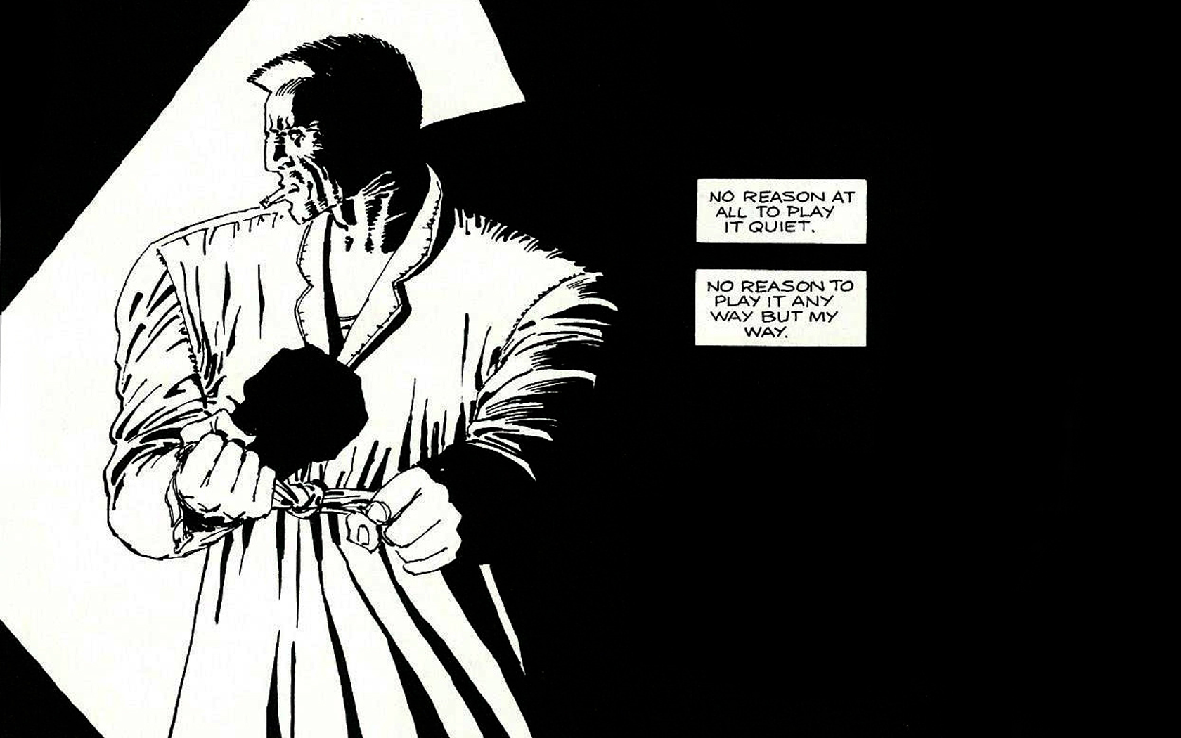 Description: A black and white drawing of a man holding a knife in his hand and a comic strip above him.