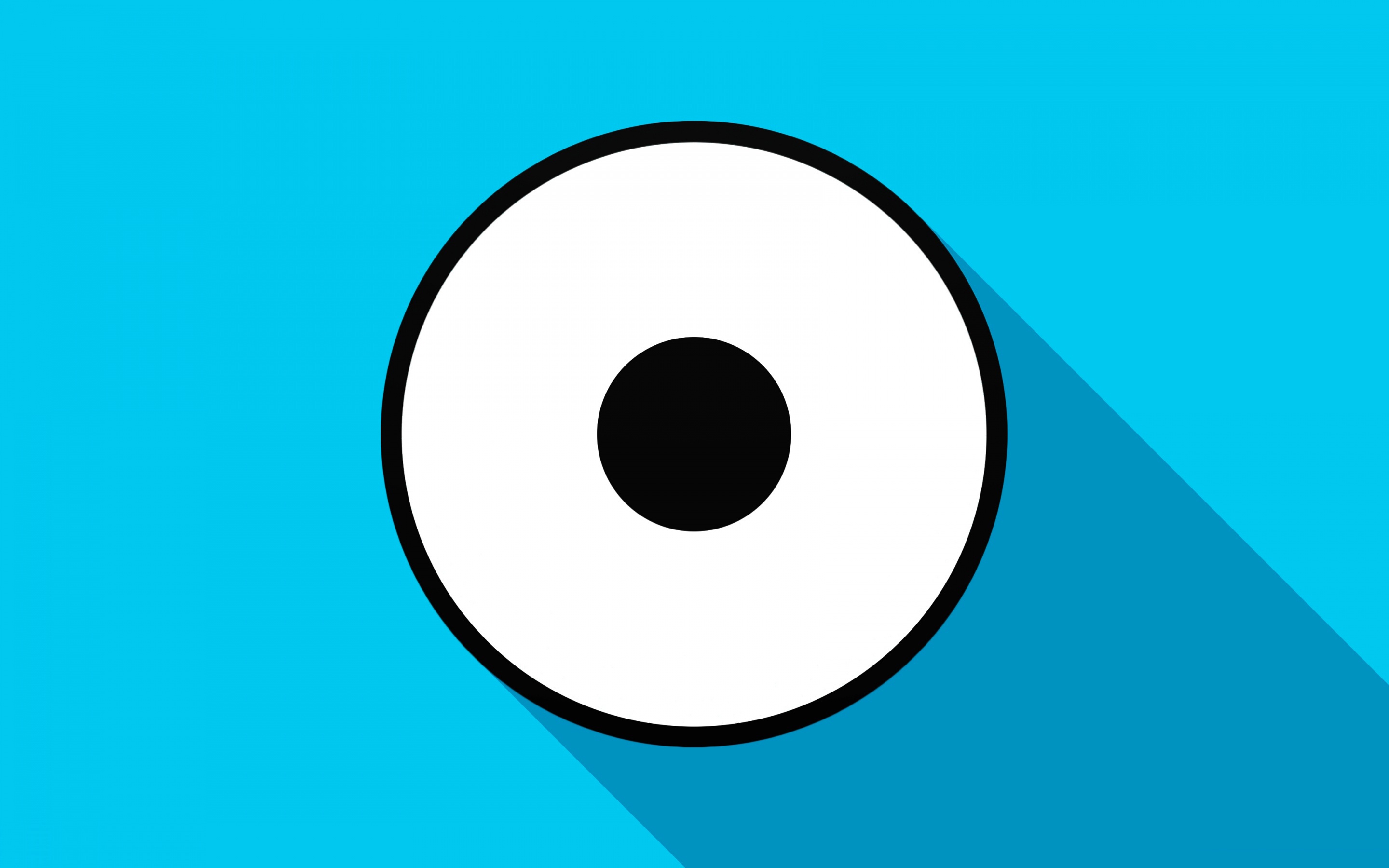 Description: A black and white eyeball on a blue background with a long shadow of the eyeball in the center.