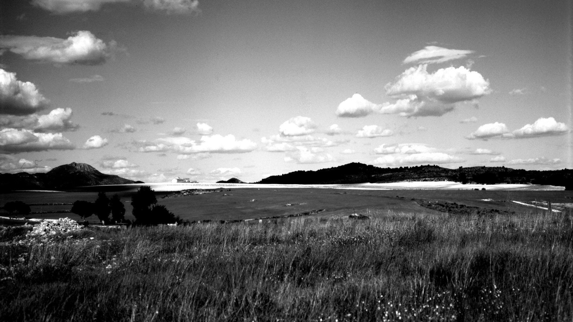 Description: A black and white photo of a field with mountains in the background and clouds in the sky above it.