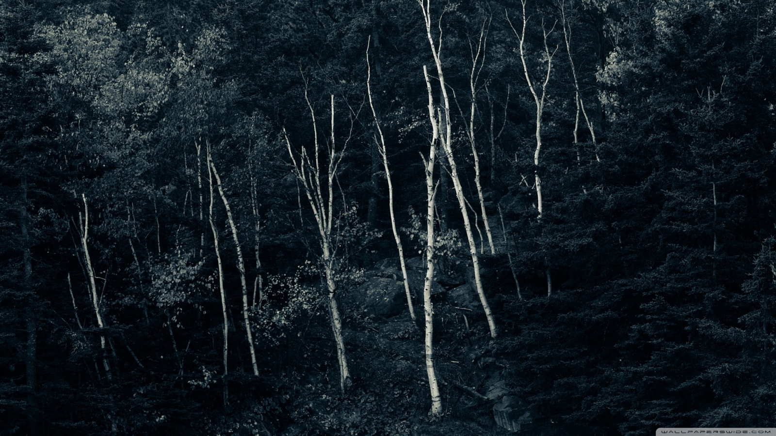 Description: A black and white photo of a forest with tall trees in the background and a boat in the foreground.