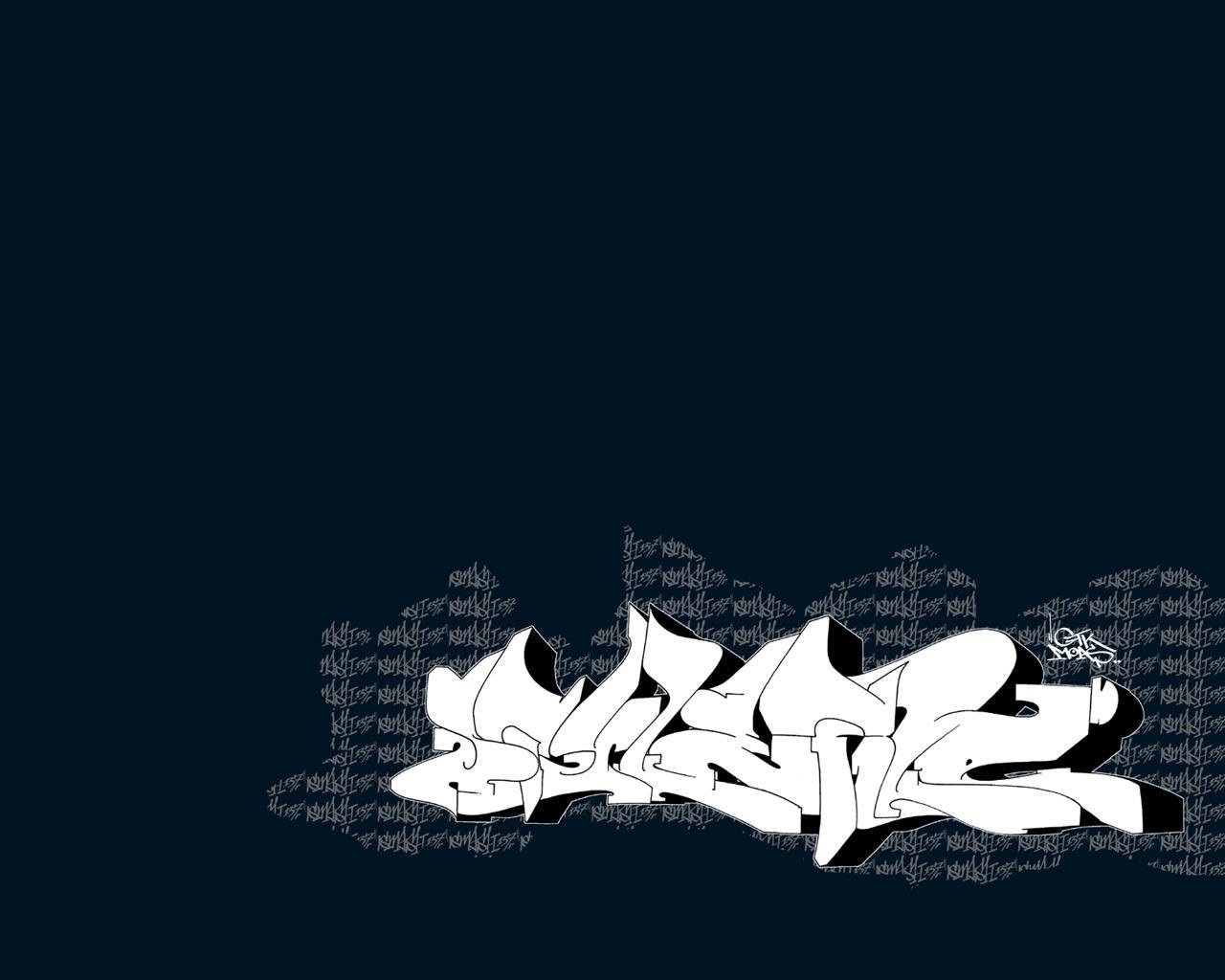 Description: A black and white graffiti wallpaper with a blue background and a white spray paint design on it's side.
