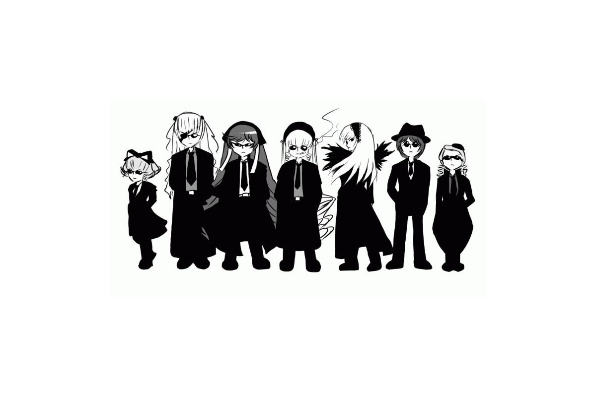 Description: A group of people in black and white standing next to each other in a line with a ghost behind them.