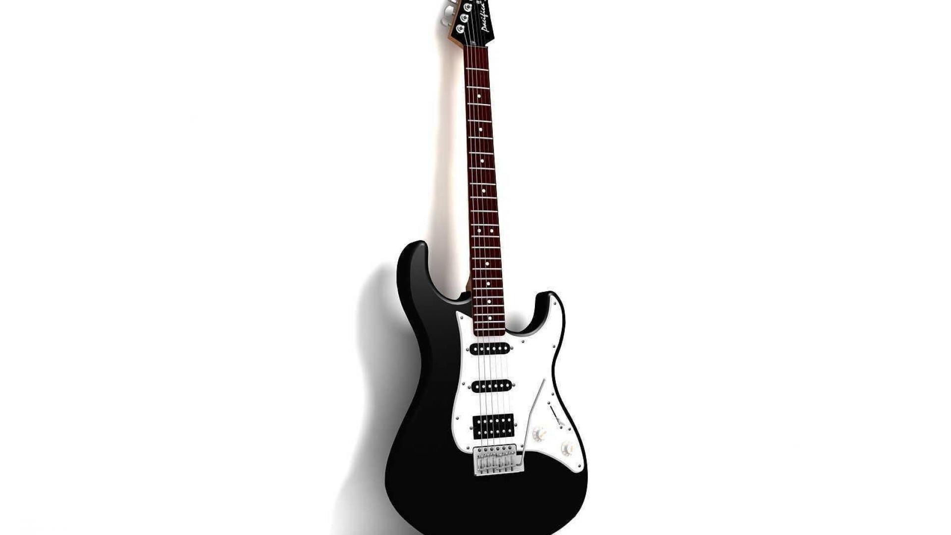 Description: A black and white guitar hanging on a wall with a white background and a black neck and neckplate.
