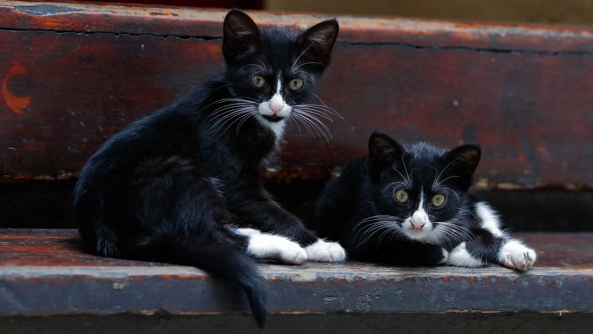 Description: Two black and white kittens sitting on a wooden bench together.