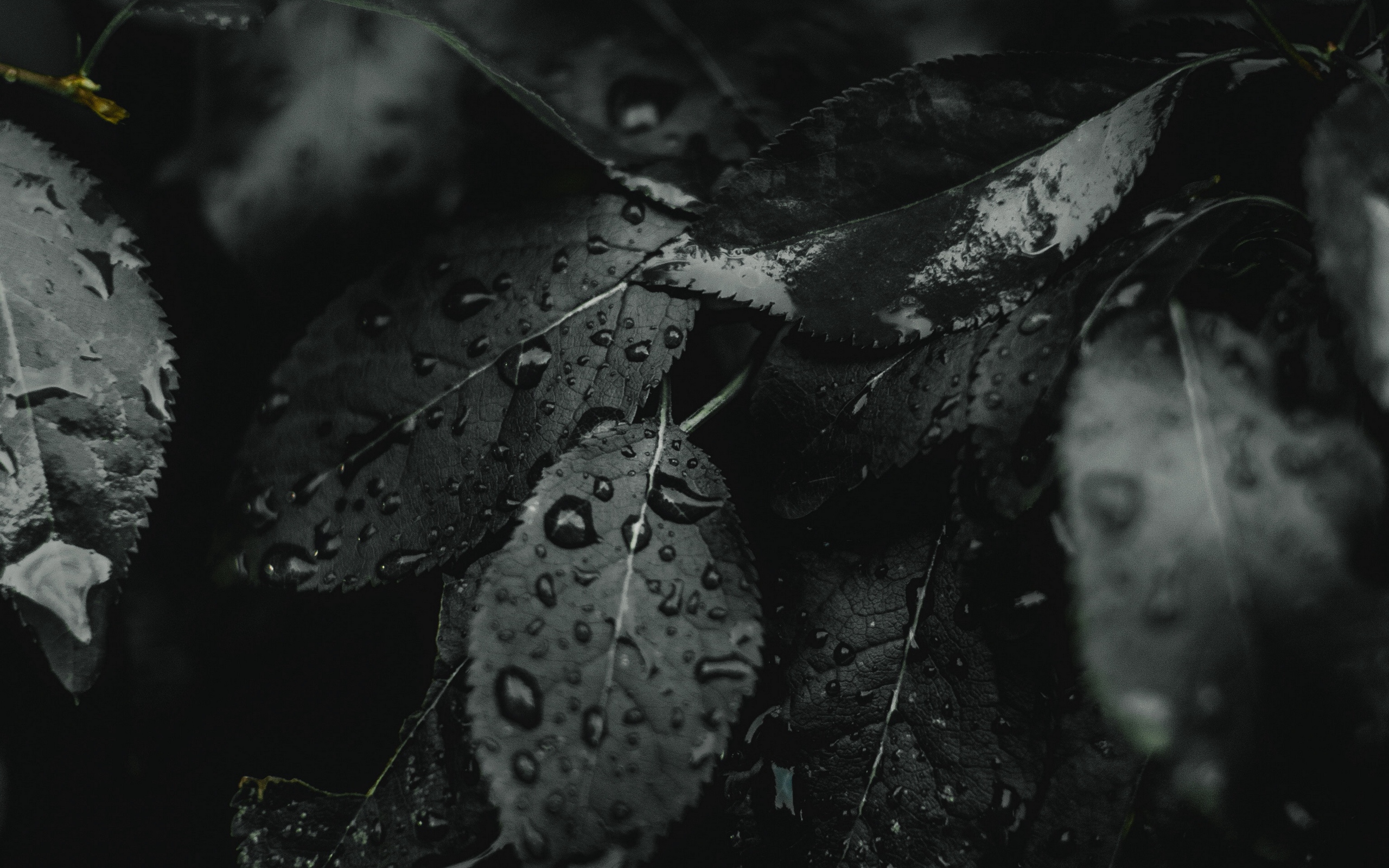Description: A black and white photo of leaves with water droplets on them.