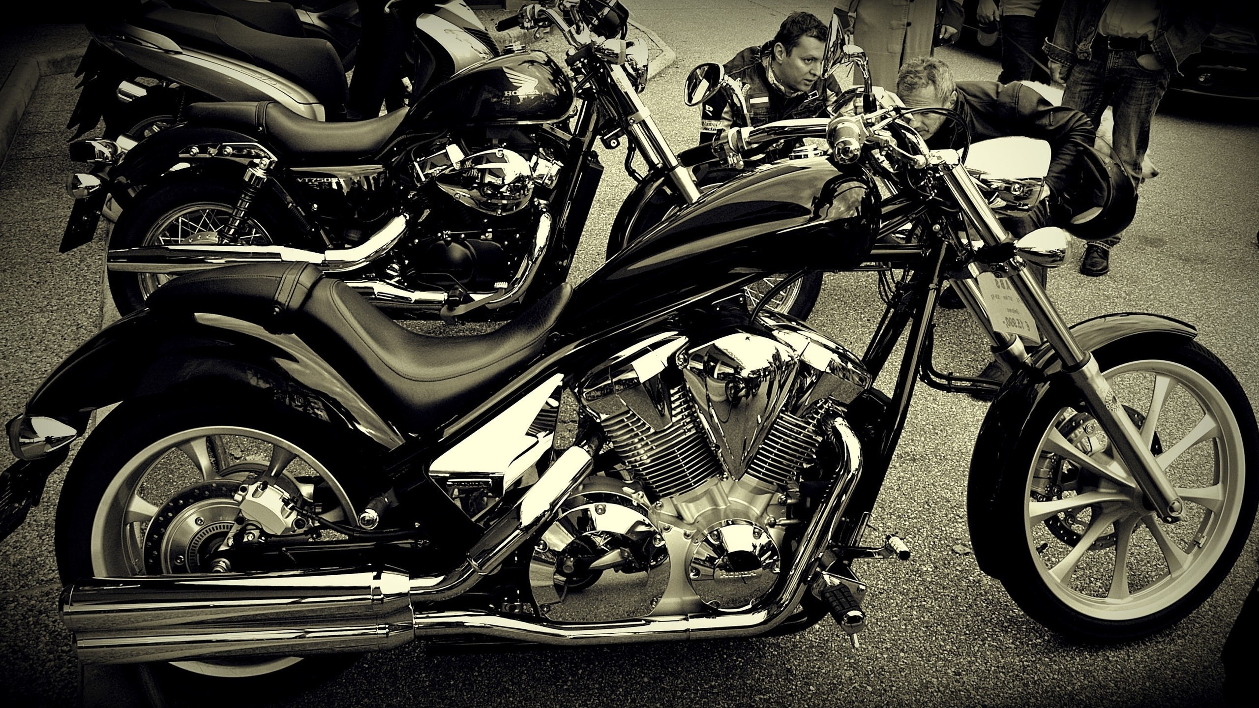 Description: A black and white photo of a motorcycle parked on the street with people looking on from the side of the bike.