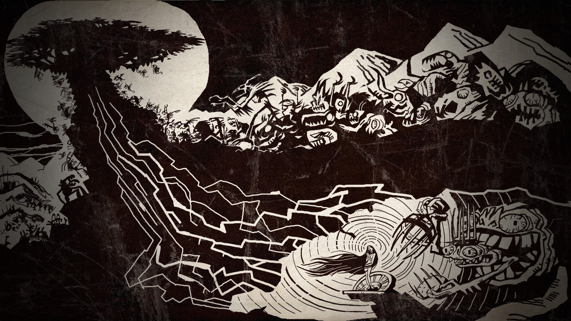 Description: A black and white picture of a mountain scene with a person riding a bike in the foreground and a full moon in the background.
