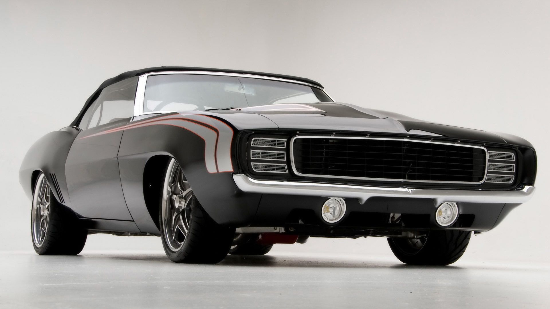Description: A black and white muscle car with a red stripe on it's side and a white background behind it.