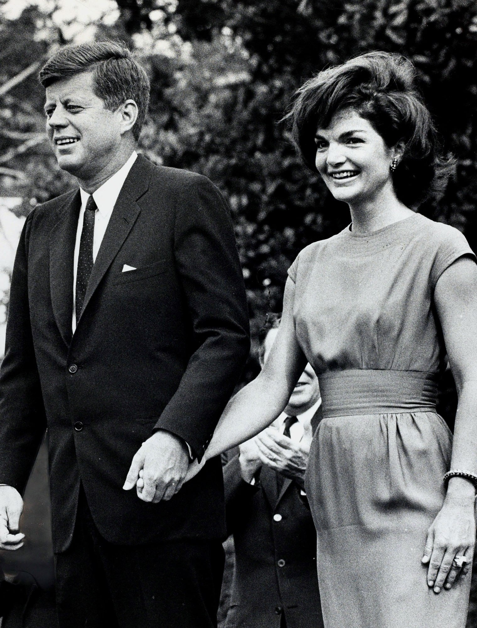 Description: A man and a woman walking together in a black and white photo with trees in the background and bushes in the foreground.