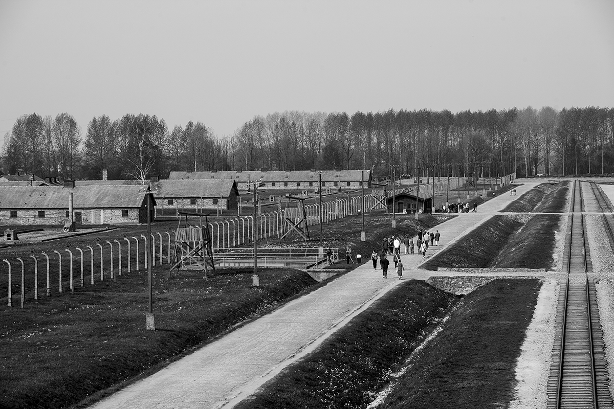 Description: A black and white photo of people walking down a path in a field with a fence and a horse.