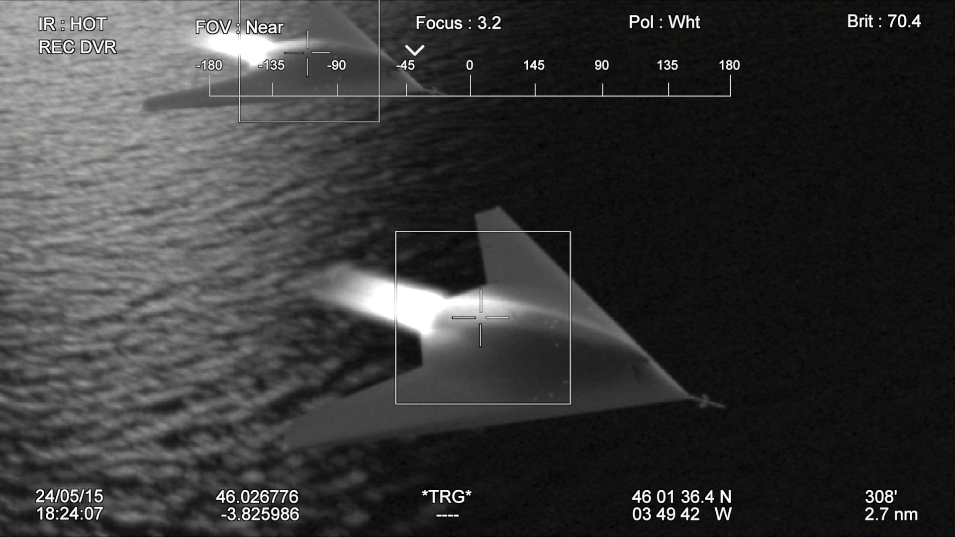 Description: A black and white photo of a plane flying over water with a light beam on it's side.