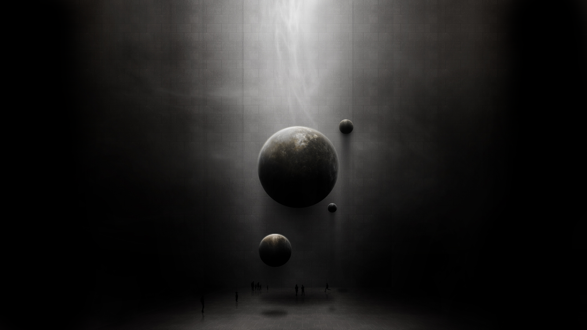 Description: A black and white photo of a planet and its satellites in a dark room with light coming from the ceiling.
