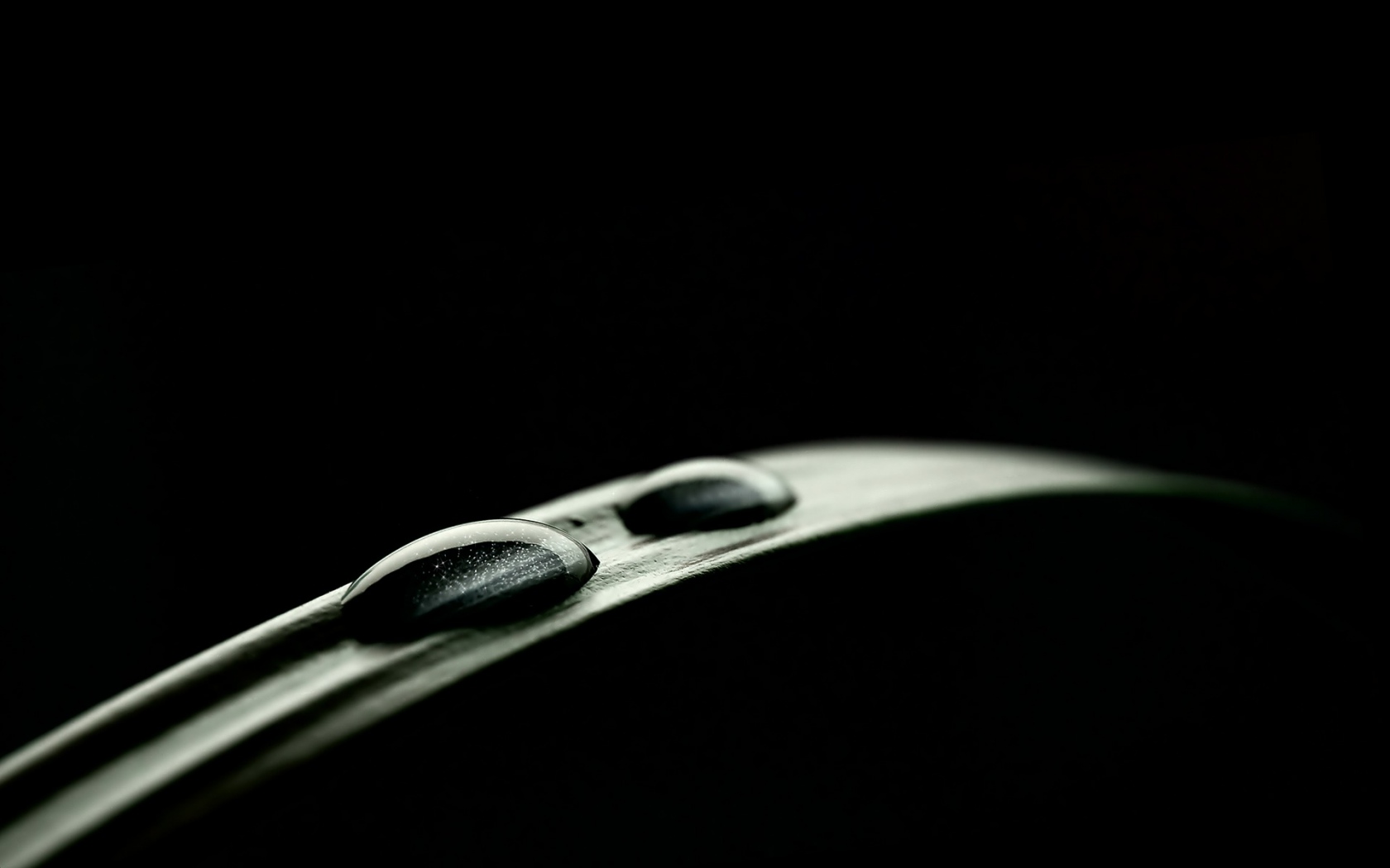 Description: A close up of a black and white photo of a plant stem with two small black dots on it.