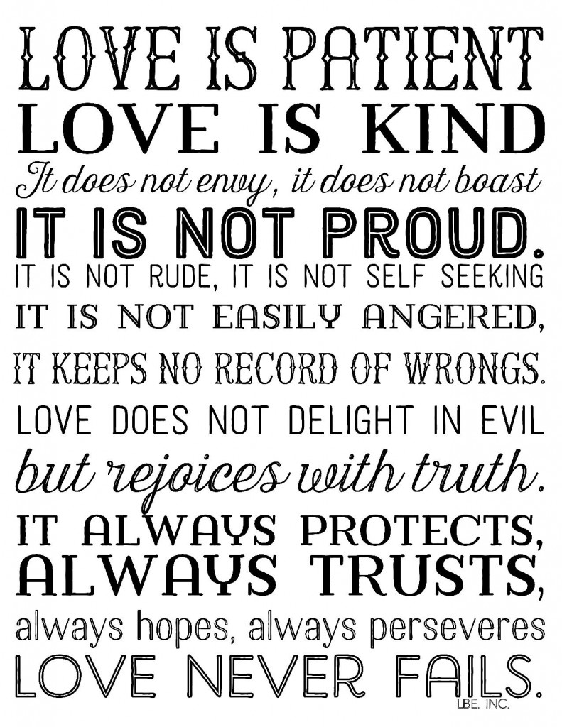 Description: A black and white quote with a handwritten poem on it that says love is patient love is kind.