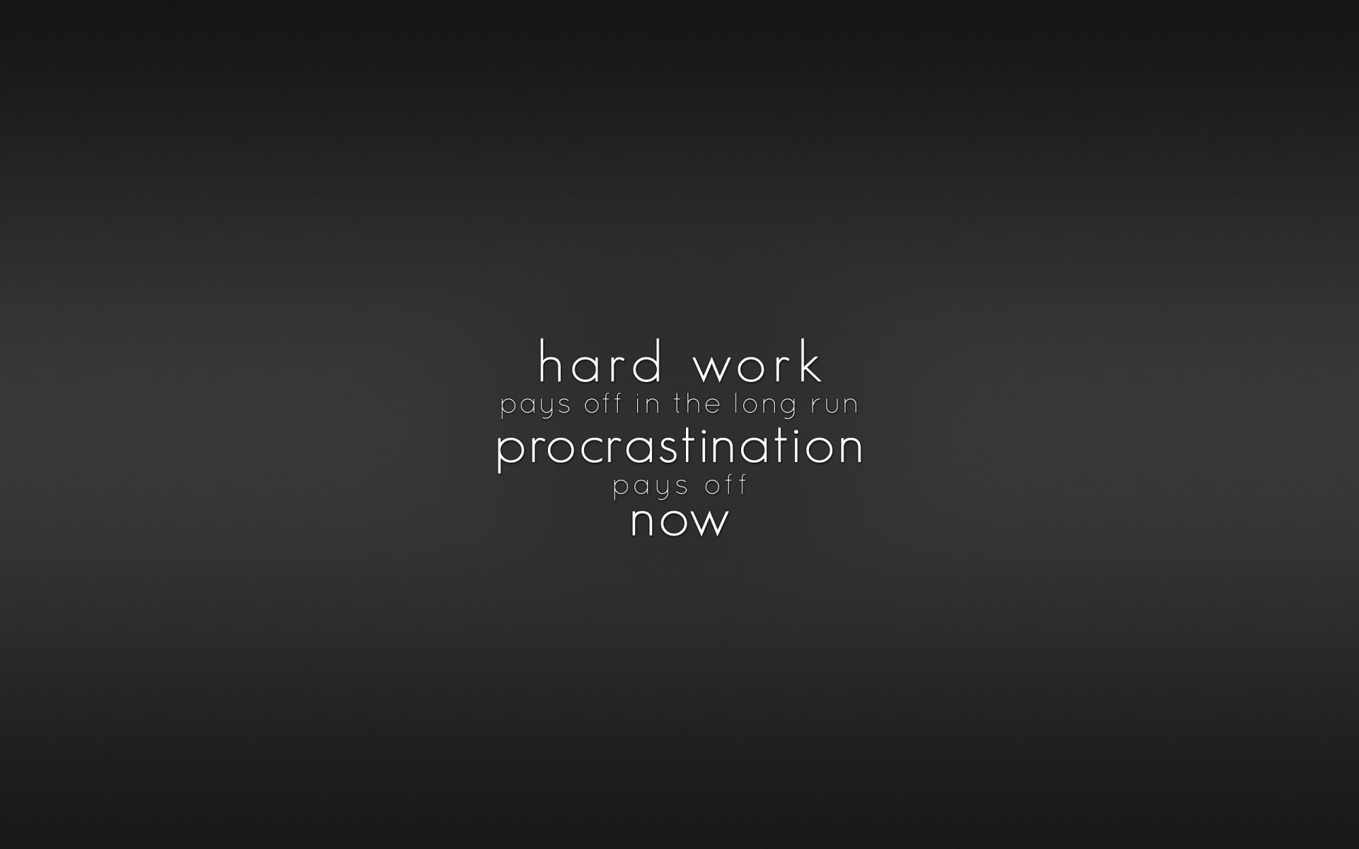 Description: A black and white photo with a quote on it that says hard work pays off the long run procrastination point of now.