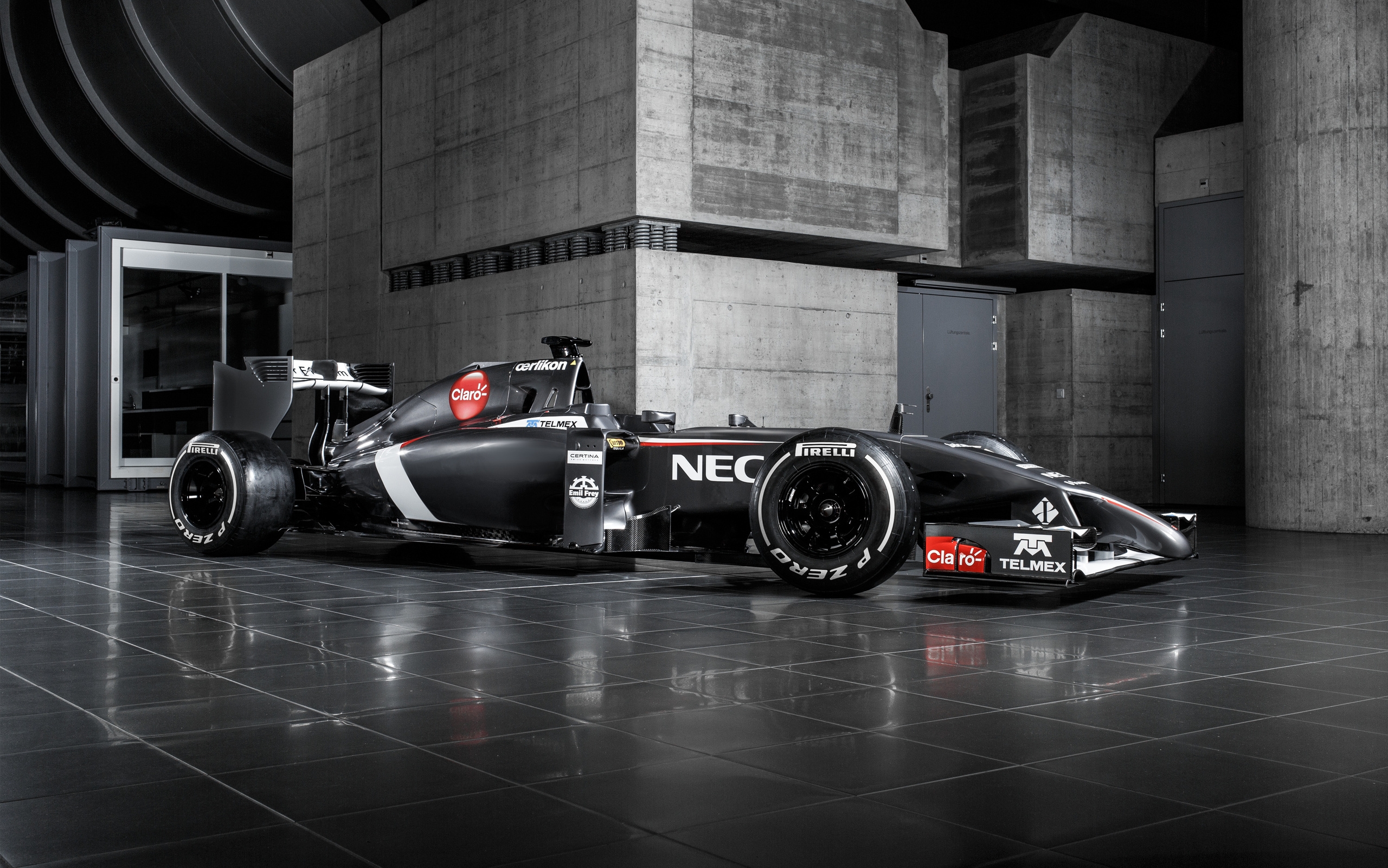 Description: A black and white photo of a racing car in a building with a black floor and a black and white background.