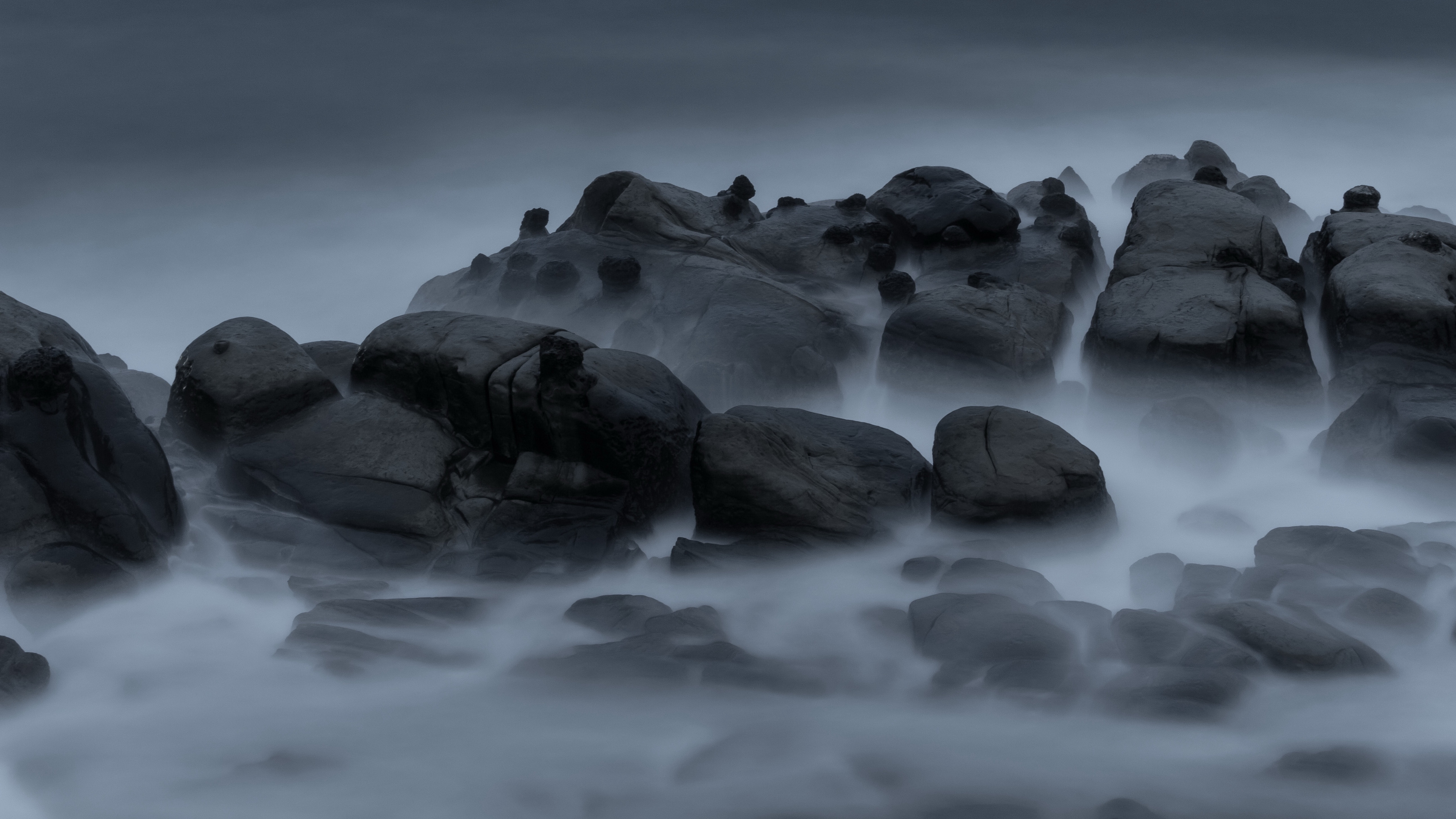 Description: A black and white photo of rocks in the water with a bird perched on top of them in the distance.
