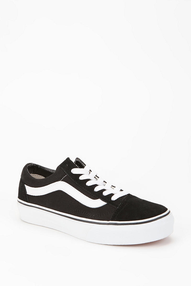 Description: A black and white shoe with white laces on the top of it and a white sole on the bottom.