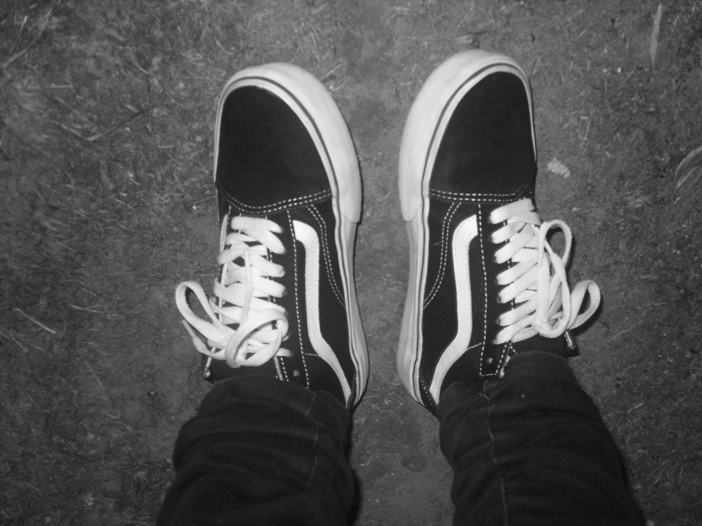 Description: A person wearing black and white shoes with white laces on them and a black and white background with a black and white photo of their shoes.