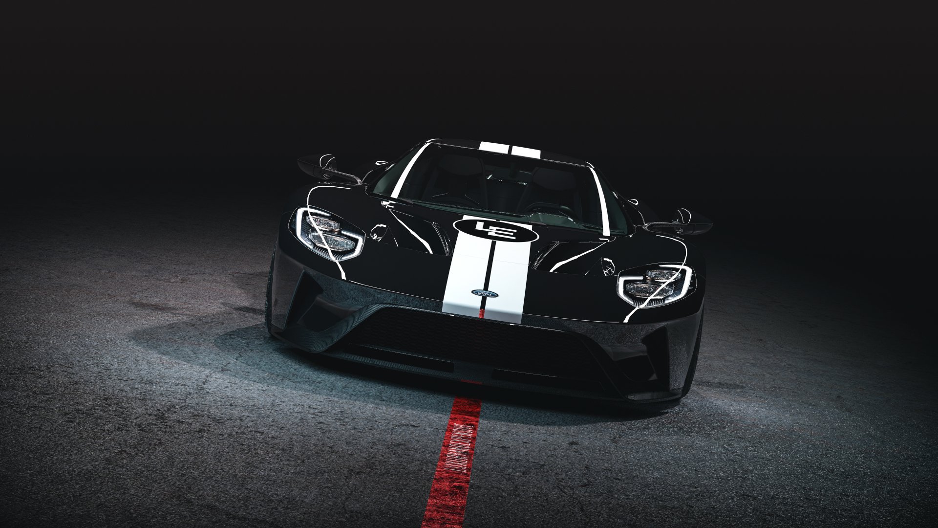 Description: A black and white sports car on a dark road with a red line in the middle of the road.