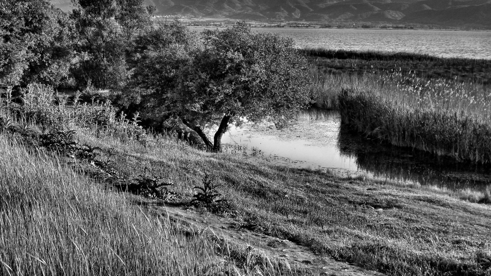 Description: A black and white photo of a tree and a river in a field with mountains in the background and a grassy bank.