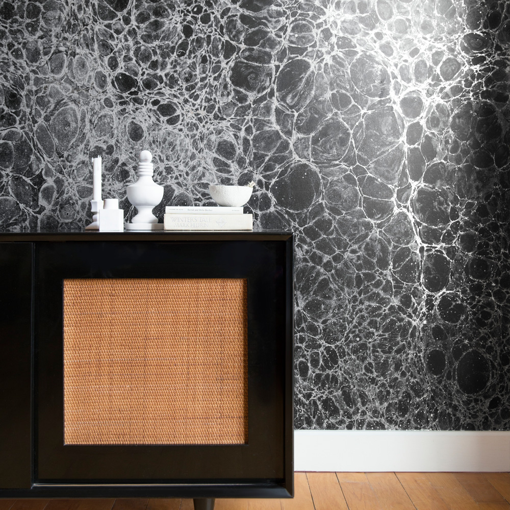 Description: A black and white wall with a black cabinet and a brown rug on top of it and a vase on the side.