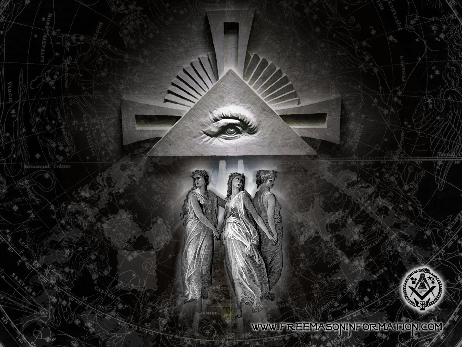 Description: A black and white photo of two women in front of a cross with the eye of providence above them.