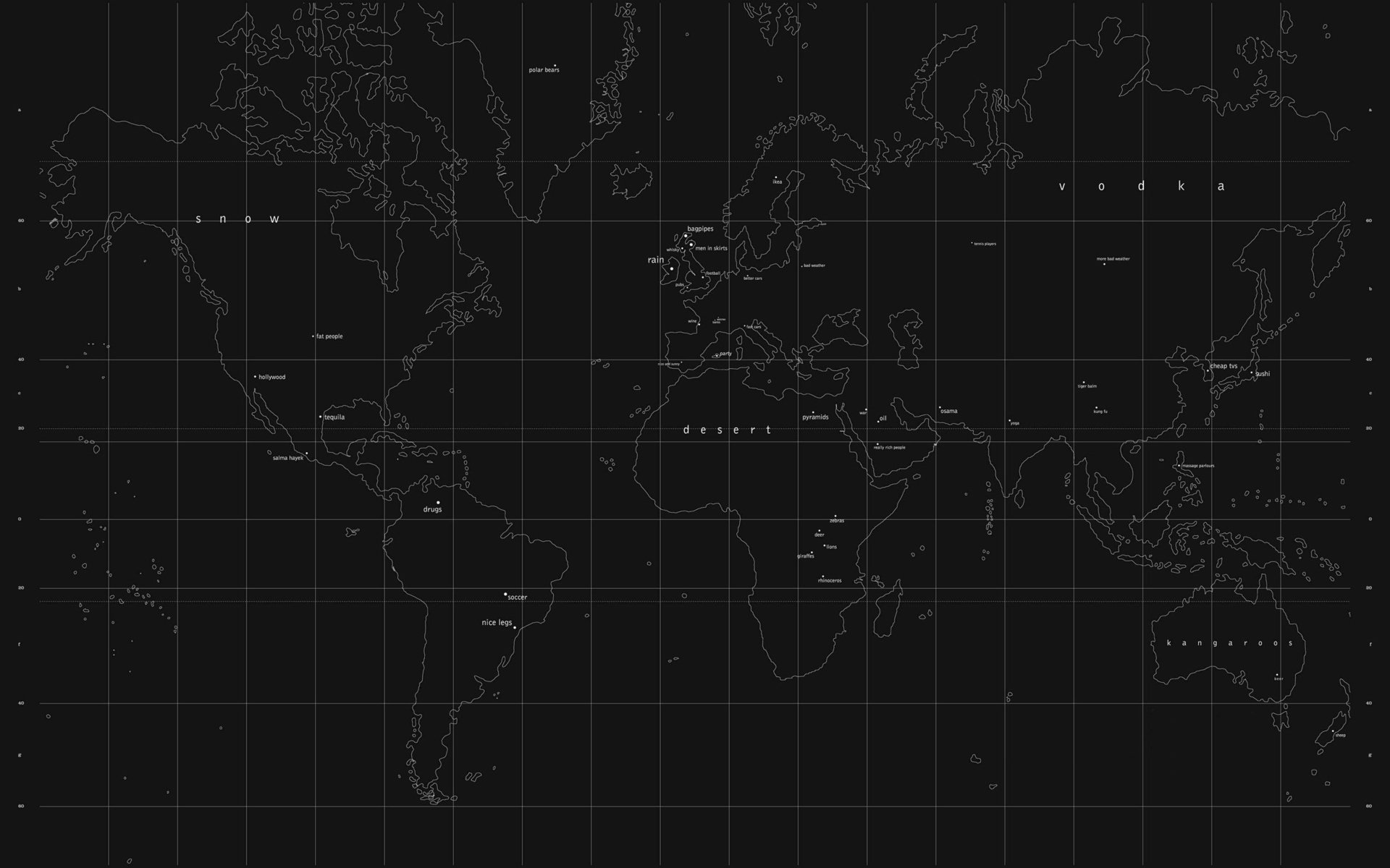 Description: A black and white world map with lines of all the countries and the names of the countries on it.