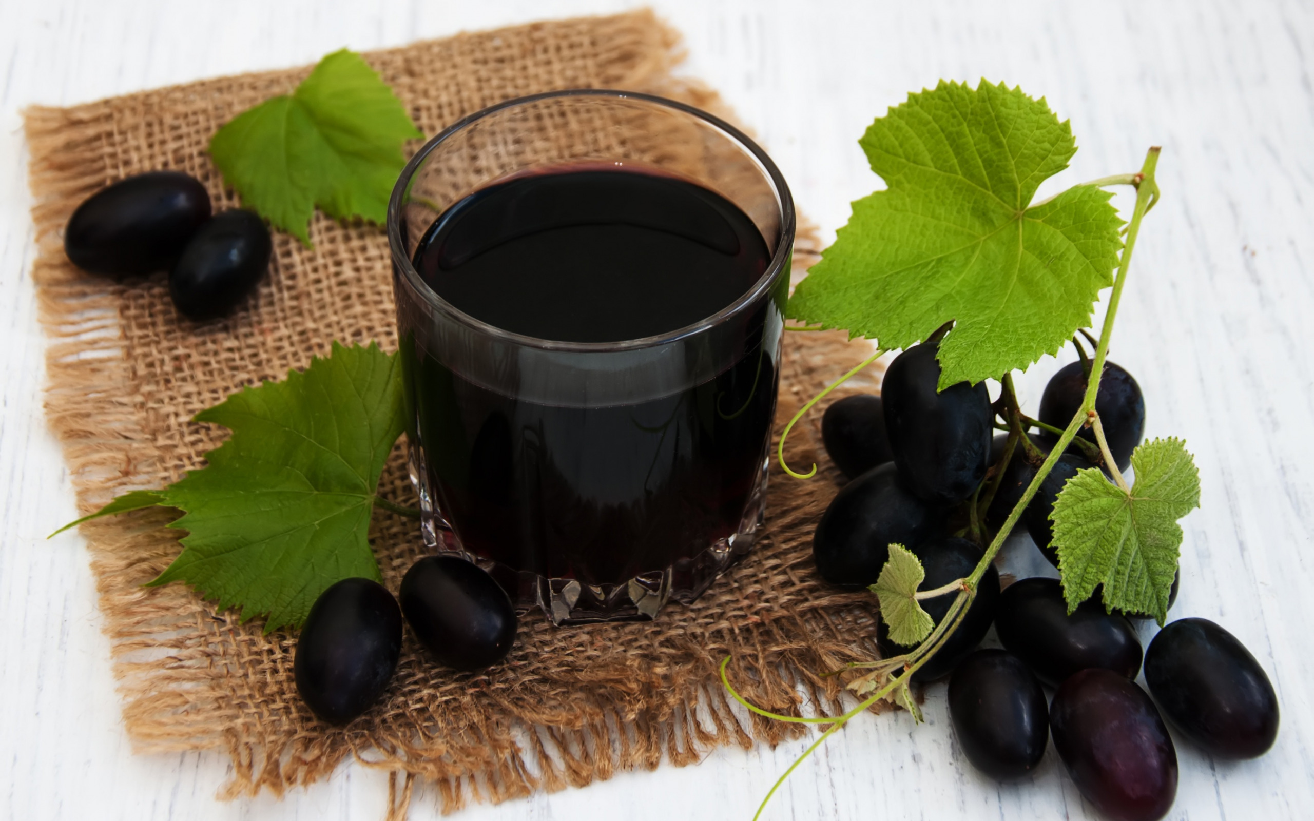 Description: A glass of black wine next to some grapes and leaves on a burlock of burlock.