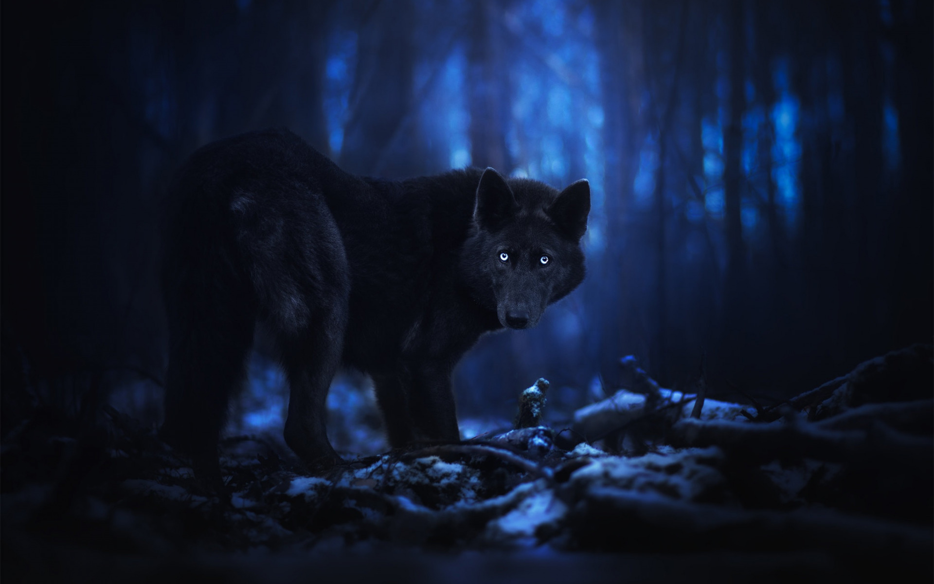 Description: A black wolf standing in a dark forest at night with a glowing light on its face and eyes.