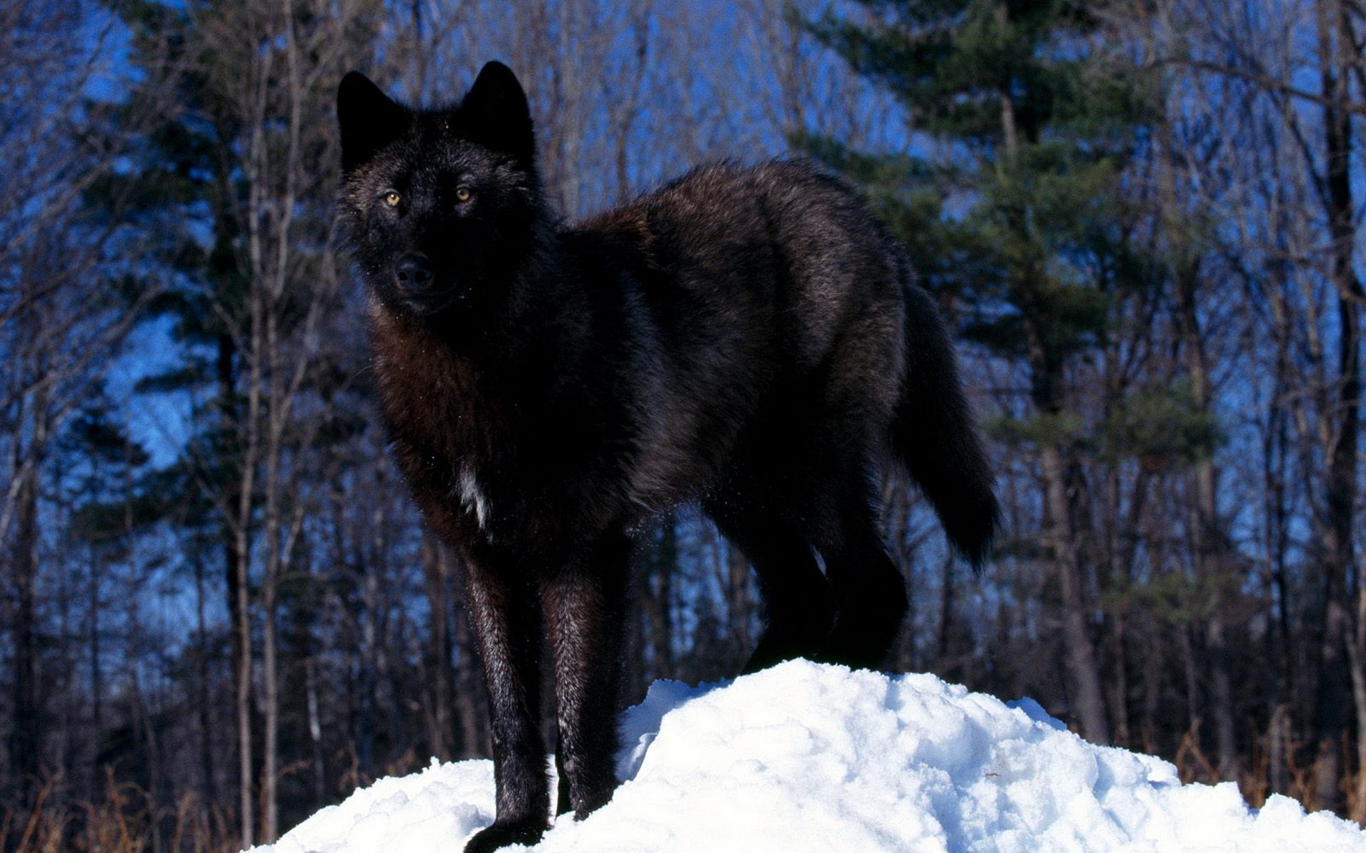 Description: A black wolf standing on top of a pile of snow in the woods with trees in the background and a blue sky.