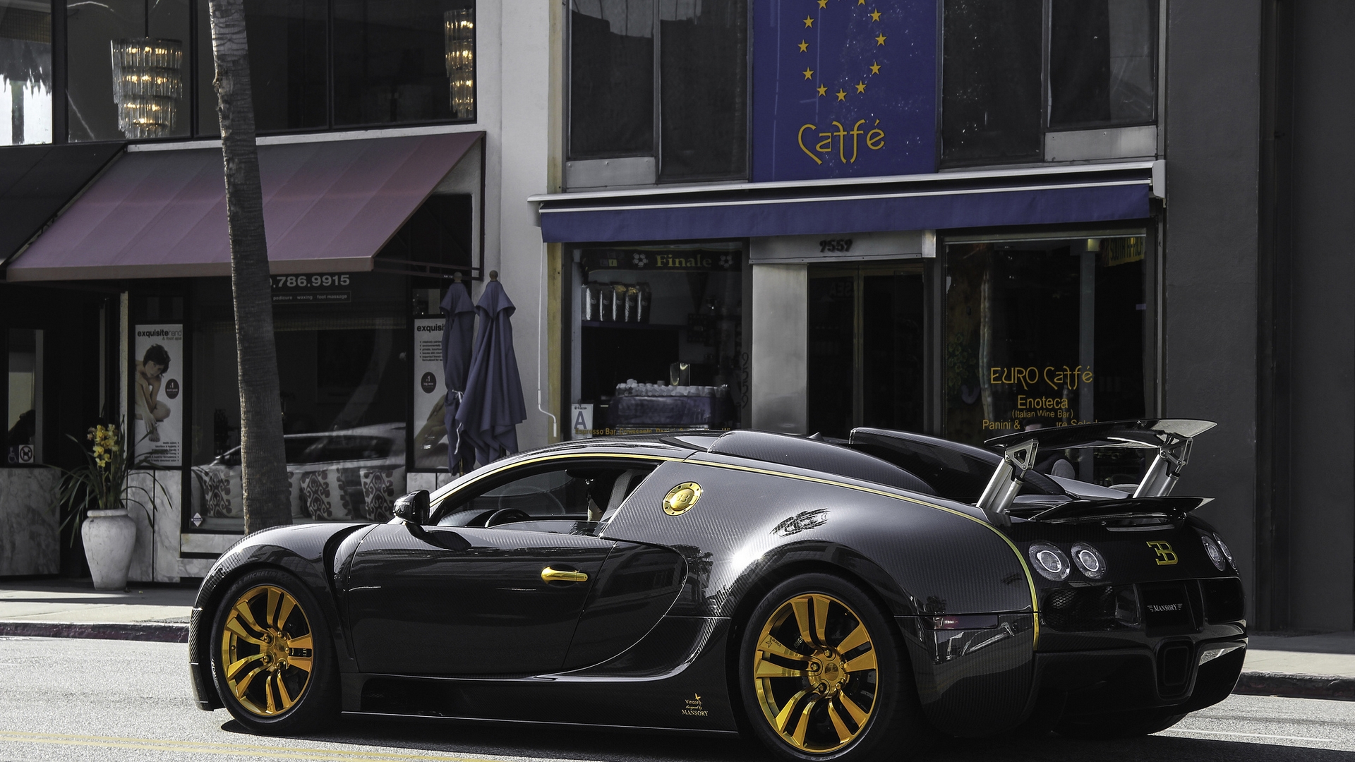 Description: A black and yellow buggy parked on the side of the road in front of a building with a purple awning.