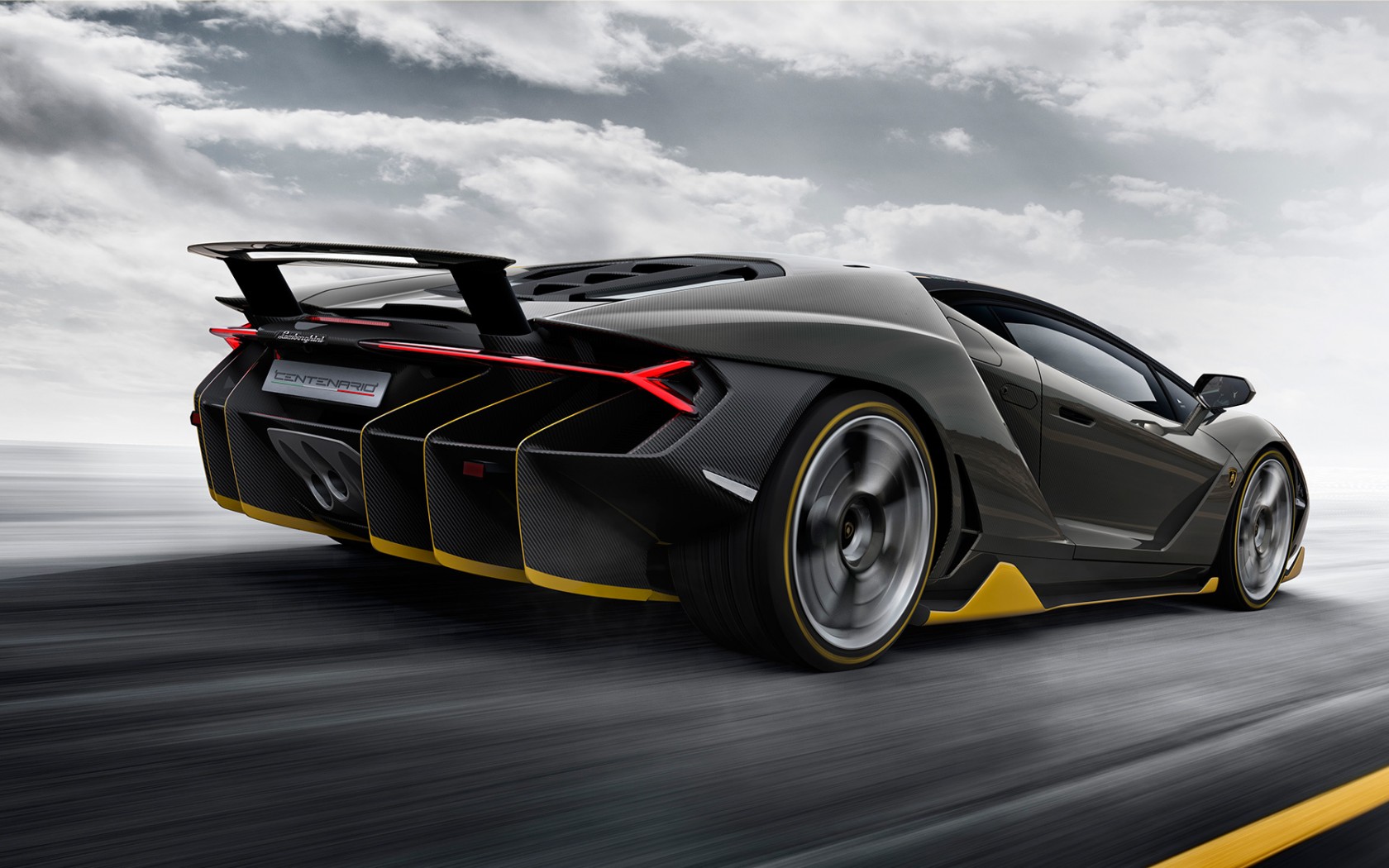 Description: A black and yellow sports car driving down a road with clouds in the background and a yellow stripe on the side.