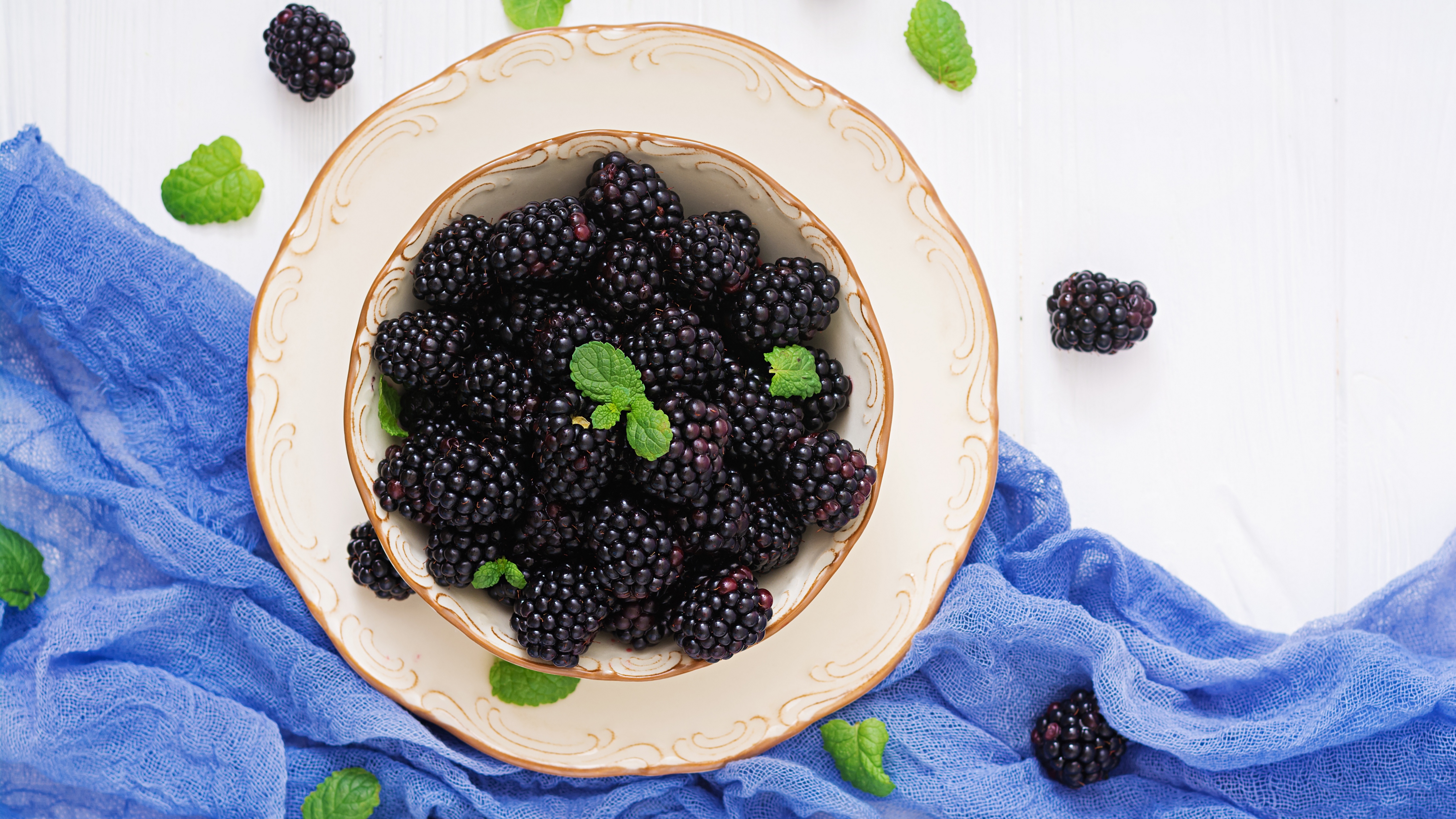 Description: A bowl of blackberries with mint leaves on a blue cloth and a blue napkin on a white table.