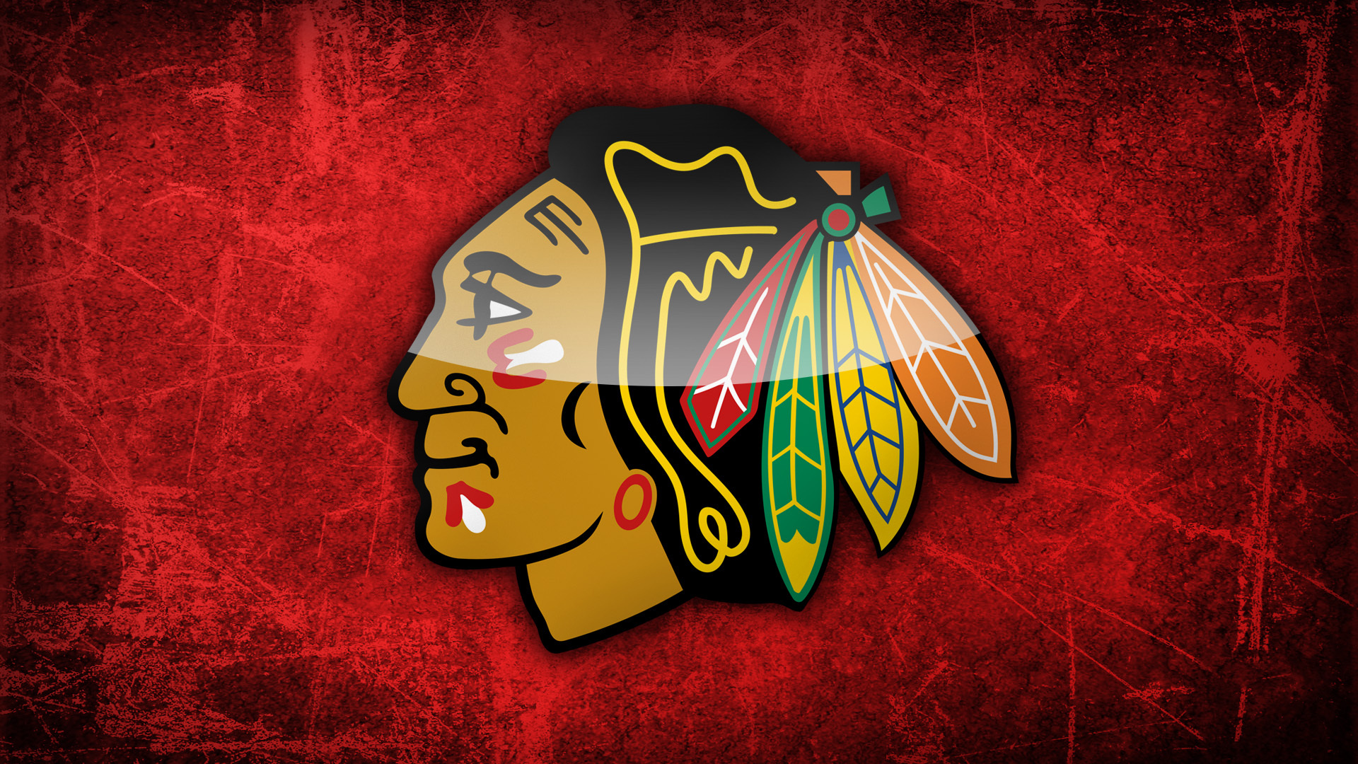 Description: A chicago blackhawks logo on a red background with a grungy effect of a woman's face.