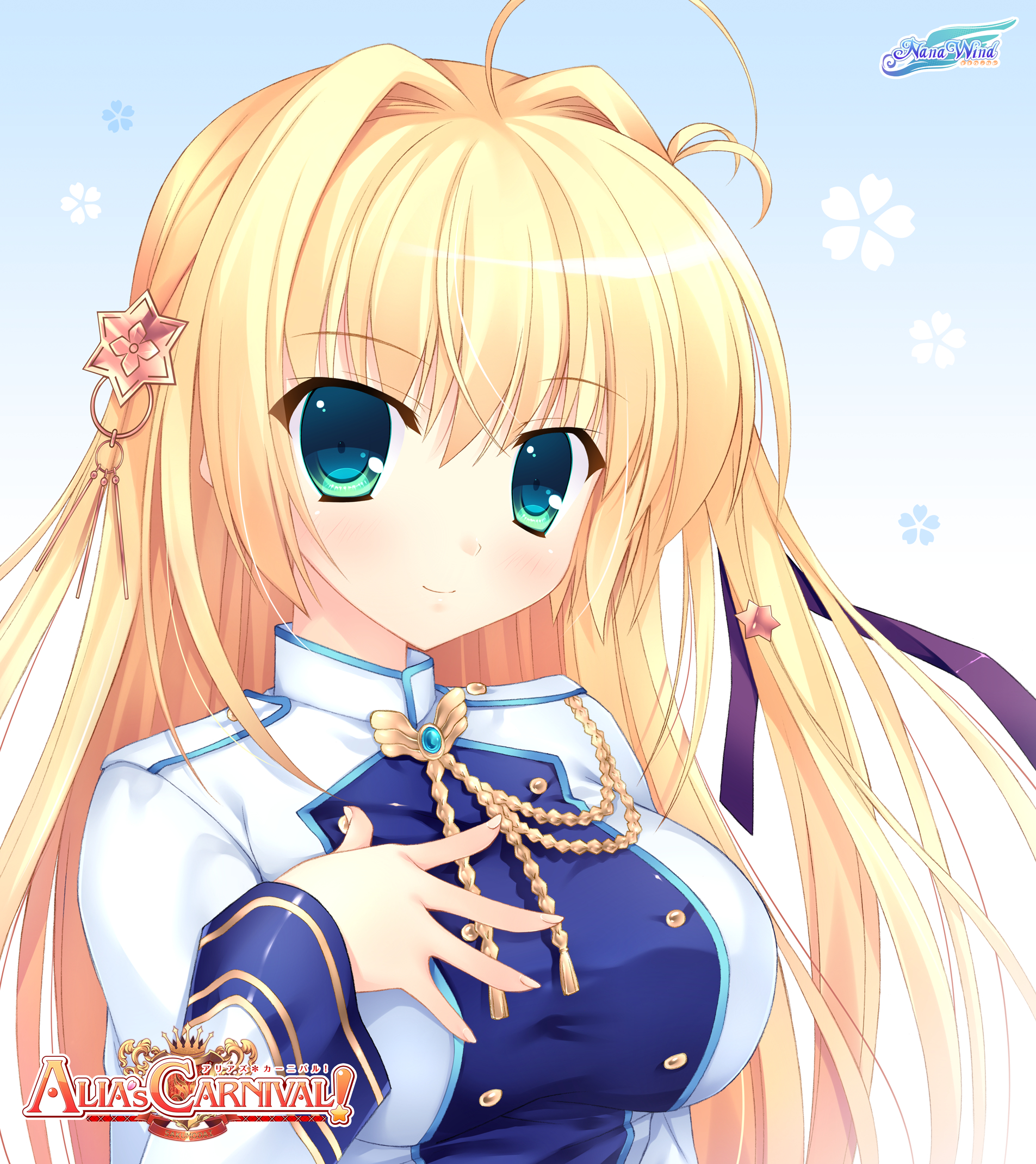 Description: A anime girl with long blonde hair and blue eyes holding a star in her hand and a blue dress.
